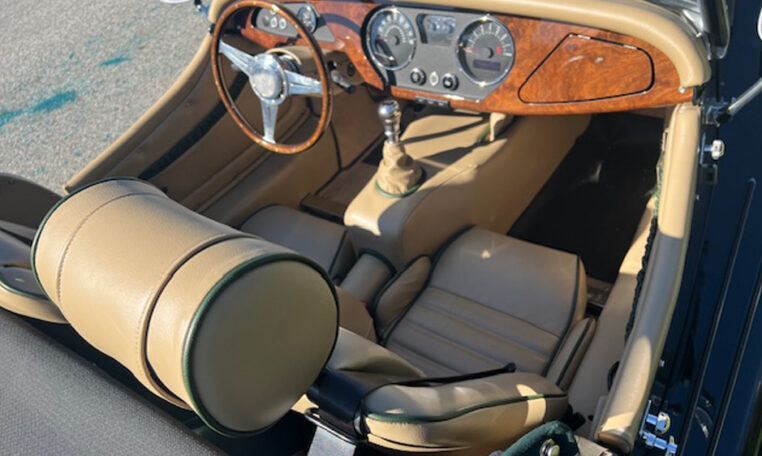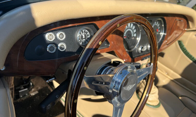 - MotoLita wood rim steering wheel with stainless steel mounting and Morgan embossed stainless horn push